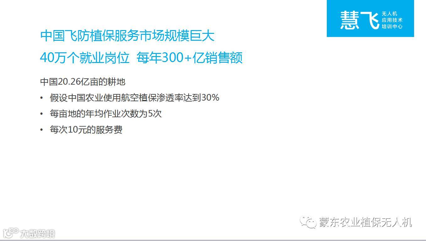 中国有21 亿亩农田,植保作业量大,无人机飞防植保是我国植保行业的发展方向,市场对植保机无人机飞手的需求量非常大,就业前景广阔。