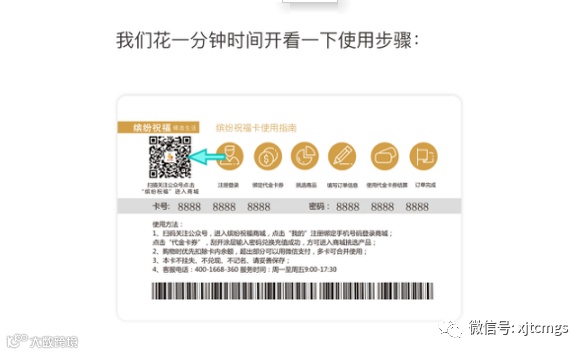 缤纷祝福卡的面值可随意定制,且使用简单,扫码关注公众号,进入缤纷祝福商城,点击“我的”注册绑定手机号码登陆商城,点击“代金卡券”,刮开涂层输入密码兑换充值成功,方可进入商城挑选商品。