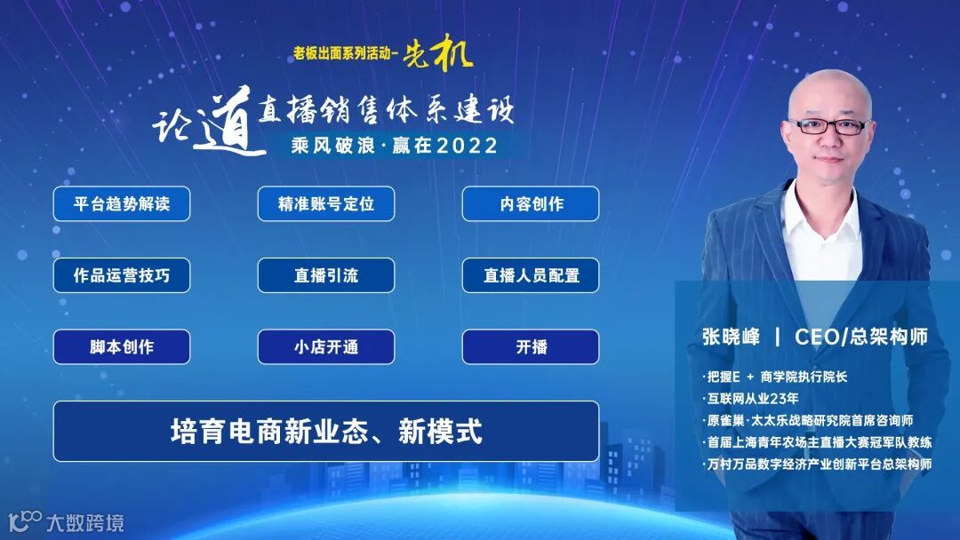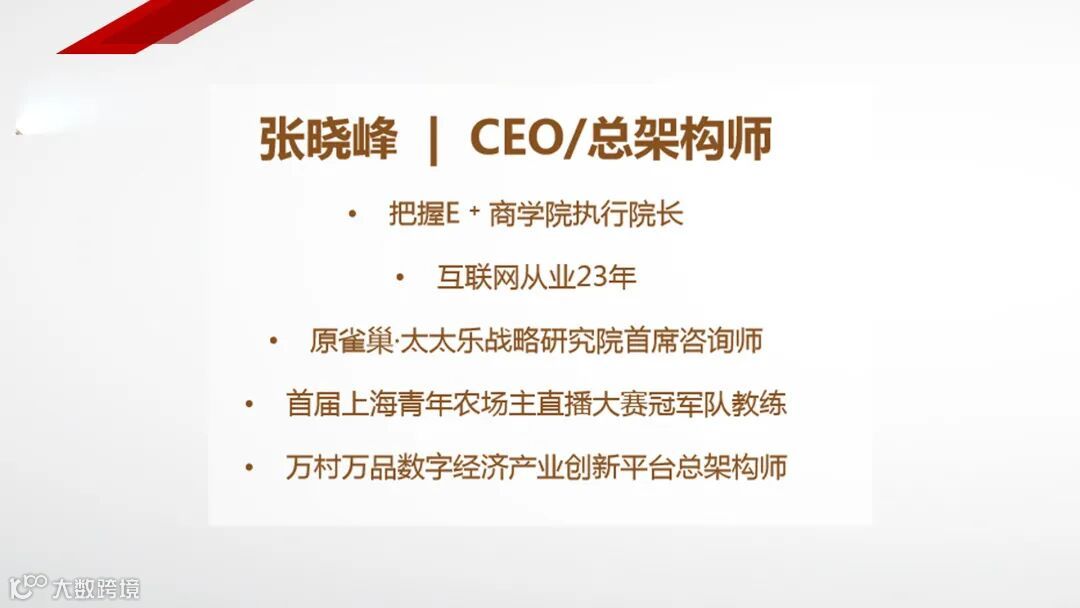 本次研讨会邀请的嘉宾是把握E + 商学院执行院长、原雀巢·太太乐战略研究院首席咨询师、首届上海青年农场主直播大赛冠军队教练、万村万品数字经济产业创新平台总架构师张晓峰老师,张晓峰从业互联网23年,具有丰富的培训、创业经验。