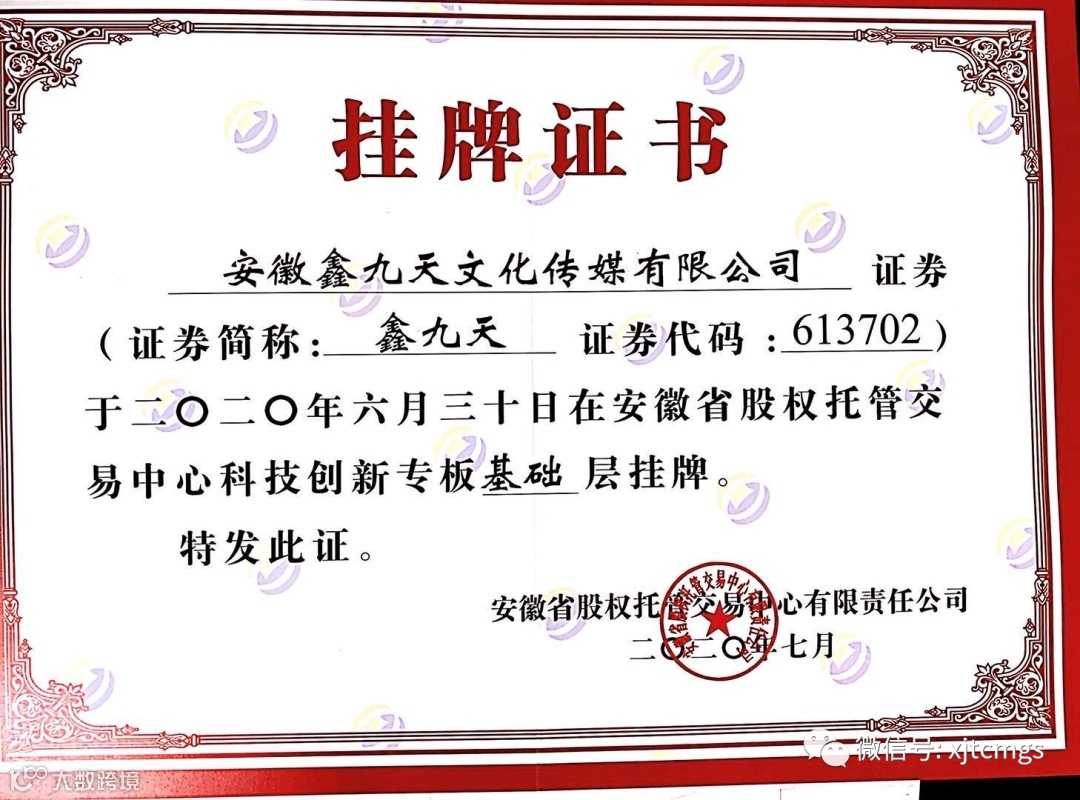 今天,安徽鑫九天传媒再收获一枚殊荣,成功取得“安徽省股权托管交易中心科技创新专板基层挂牌”证书,这个荣誉也是对我们这些年来付出的肯定与鼓励!