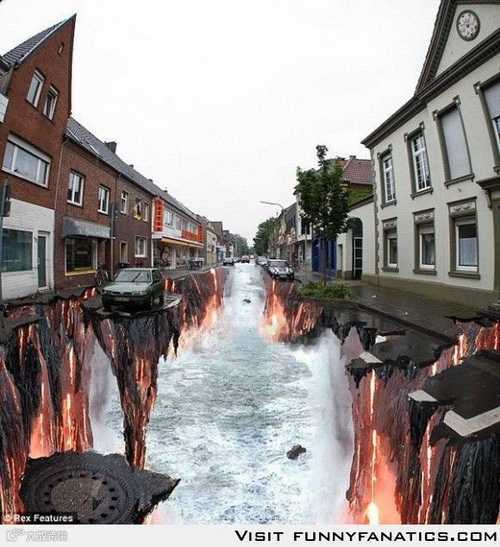 在街头绘制的这种3D画,水平达到一定程度,能够以假乱真,让人大吃一惊!比如下面这些作品,不看看清楚,还真不敢走上前去。