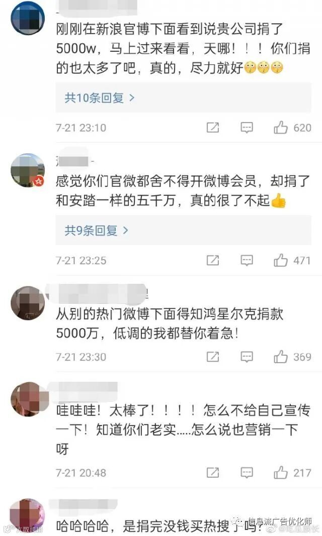 “感觉你们官微都舍不得开微博会员,却捐了和安踏一样的五千万,真的很了不起”