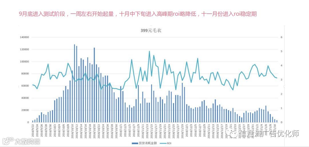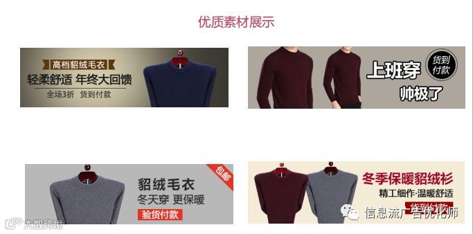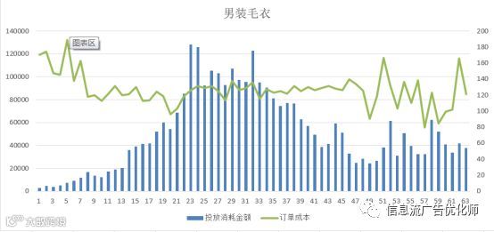 男装毛衣:商品定位,399两件毛衣,二三线城市中老年群体,投放微信文章,平均订单成本90-130,总体占点击率2-4%,cpc0.5-0.7。