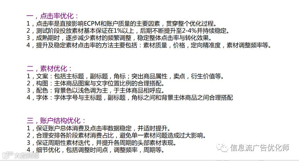 账户结构优化:稳定素材迭代,保证总体点击,提升总体ECPM,调解高中低素材投放比例,周期性总结与调整,保证效果持续性。