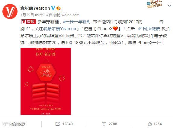 品牌联合搞事情已经不是新鲜事,此次新年辞旧迎新活动,意尔康联合上百位蓝V开展了一场“品牌蓝V冲顶赛”。