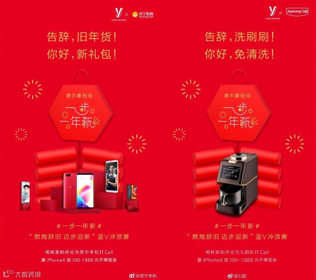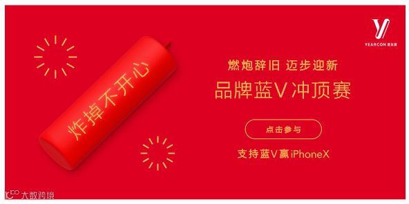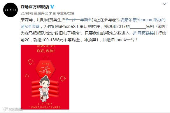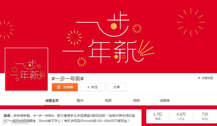 意尔康领衔蓝V团,开展微博#一步一年新#的话题,在话题页与上百位蓝V联名开展互动活动,带话题并转评选择你想支持的蓝V,就能为他增加“电子鞭炮”。