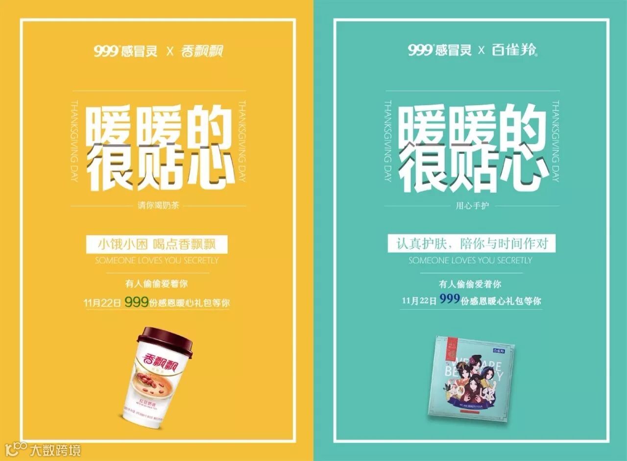 在话题讨论愈演愈热的同时,999携手蓝V们放出第二弹——送礼活动,香飘飘、百雀羚、东鹏特饮等联名制作活动海报,为粉丝们献上暖心大礼包。