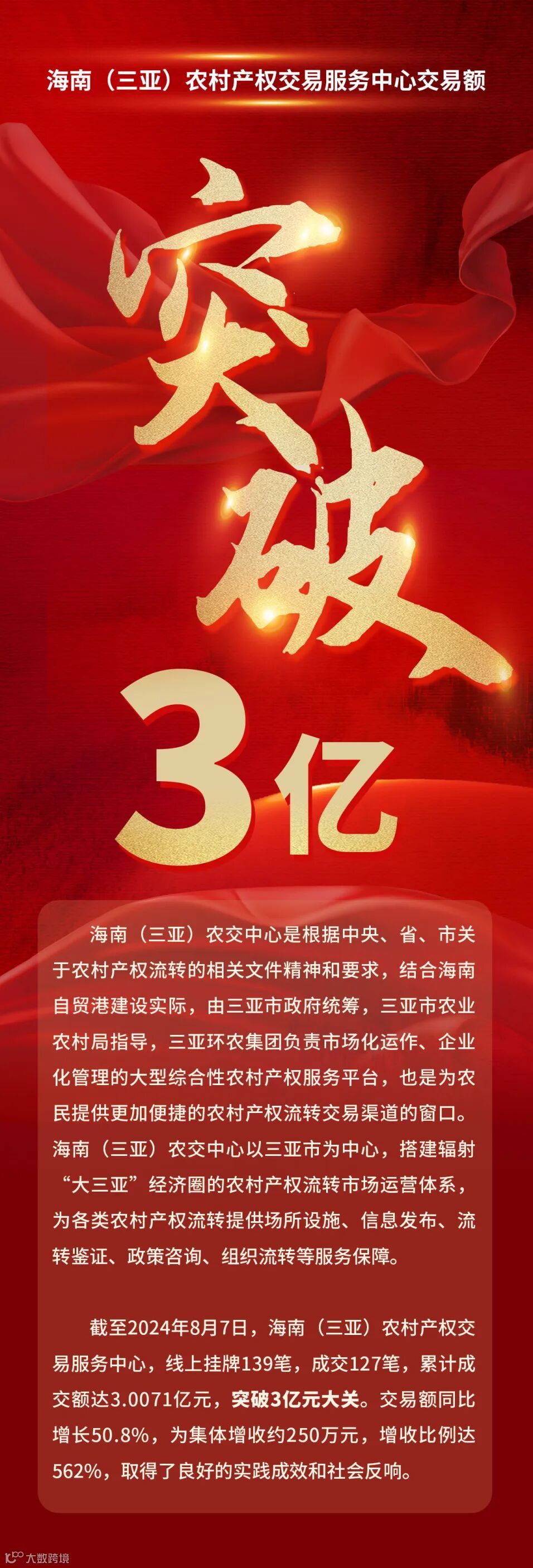 2024年8月7日,随着“三亚市天涯区西岛社区居民委员会213.37平方米原西岛老人活动中心整栋出租项目”经过7轮竞价后,最终溢价35.5%顺利成交,海南(三亚)农交中心交易额成功突破3亿元大关,成绩再创新高。