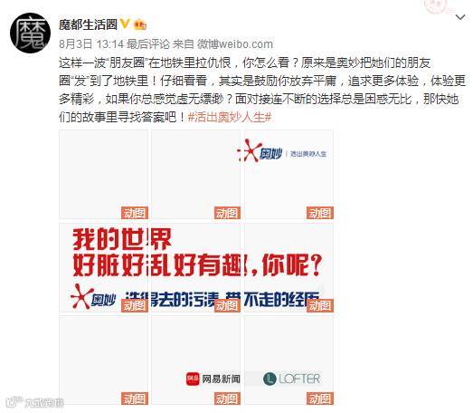 奥妙在上海地铁站内推出“活出奥妙人生”的系列广告,签约模特、音乐狂热分子、把生活活成交响乐的胡欢欢、参加世界级障碍赛“斯巴达勇士赛”的勇士赵奕欢等等被做成朋友圈张贴在地铁站内。
