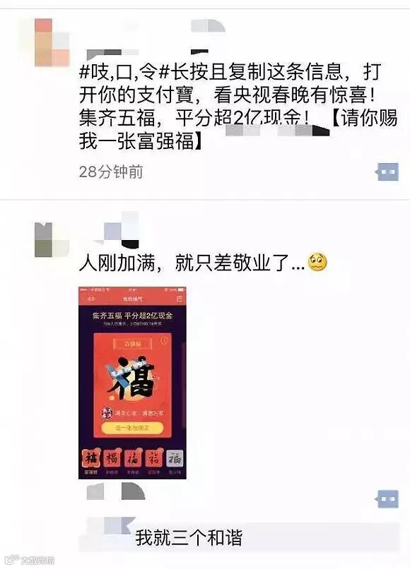 其中,“五福临门”的玩法是用户集齐五张不同福卡(富强福、爱国福、和谐福、友善福、敬业福),就可在除夕夜平分春晚支付宝两亿元的现金红包。面对这样的诱惑,很多网友开始参与活动。
