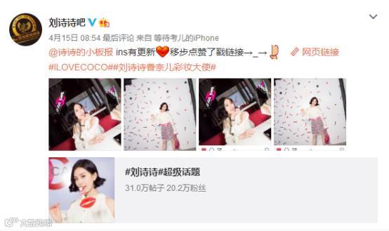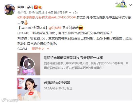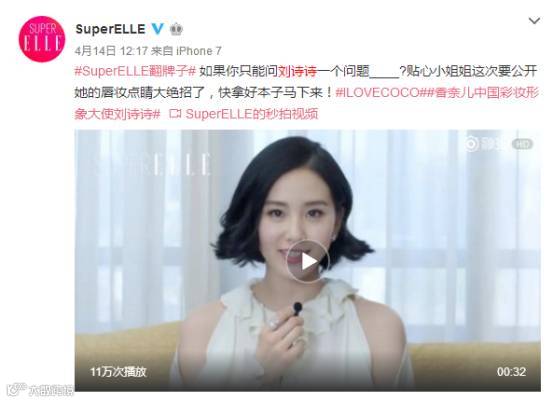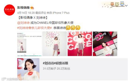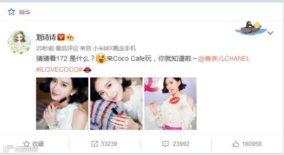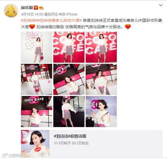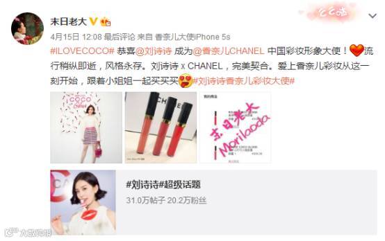 2017年,CHANEL特邀颜值与实力并存的新一代新生偶像刘诗诗作为中国彩妆大使,开启可可小姐唇露限时咖啡店试色活动,通过粉丝征集与宣传,与刘诗诗一同开启一段闪耀缤纷的美好时光!以#刘诗诗香奈儿彩妆大使#为话题开启了CHANEL新一轮营销。