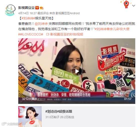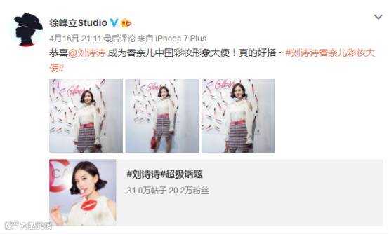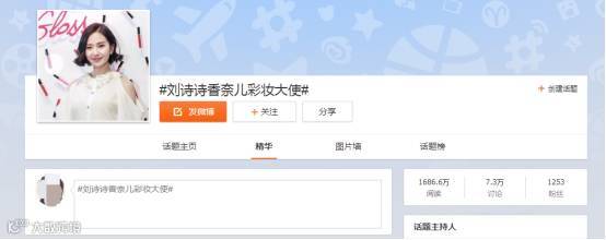 话题#刘诗诗香奈儿彩妆大使#累计阅读1686.6万,讨论7.3万,粉丝1253(部分效果来自于全网投放)