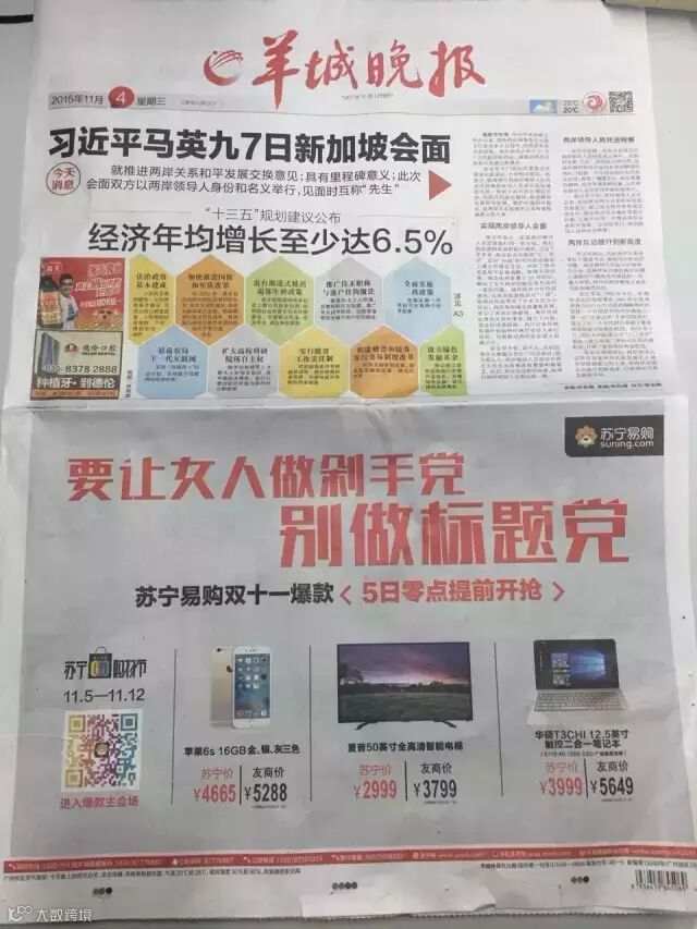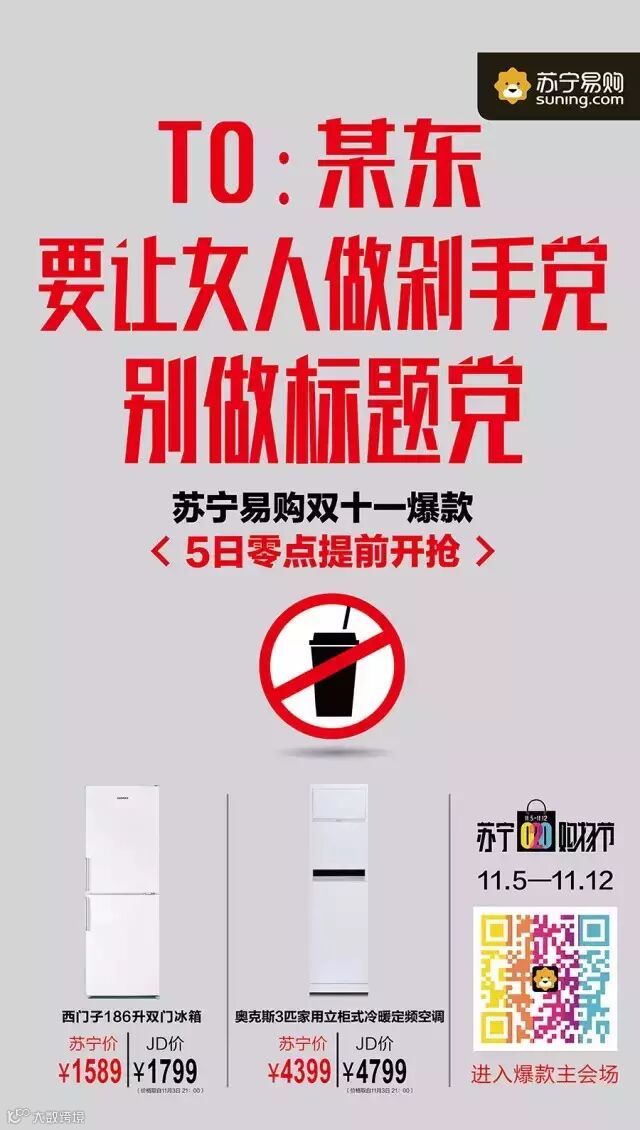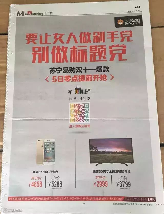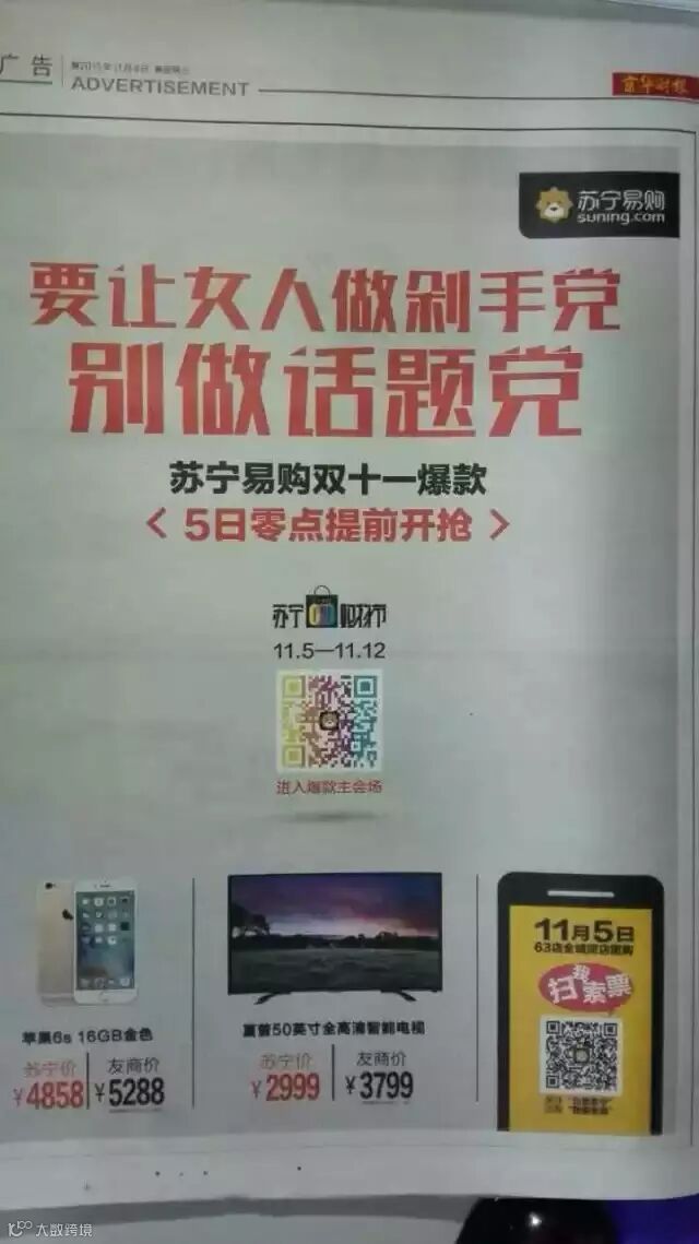 昨天,苏宁在北上广各地的主流纸媒上刊登了大幅广告,宣称:要让女人做剁手党,别做标题党/话题党!
