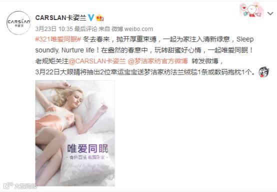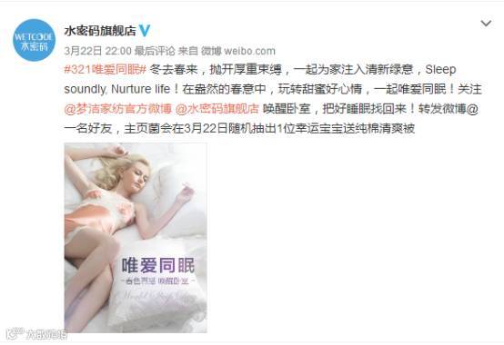微博具有传播快、及时、成本低、见效快等优势,所以此次梦洁家纺的营销活动,贴合3月21日世界睡眠日的主题,采用微博话题#321唯爱同眠#+转发抽奖活动等方式进行新一轮推广。