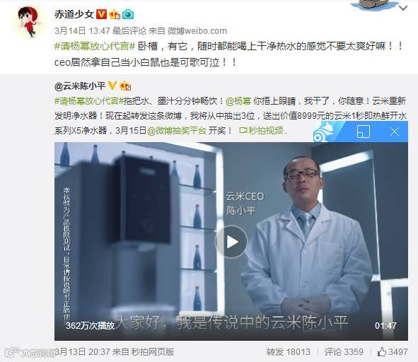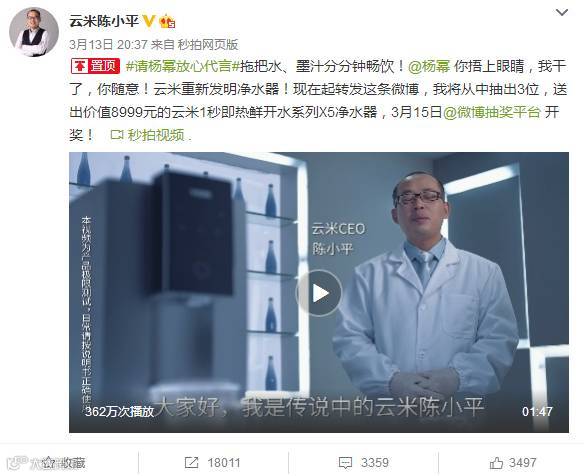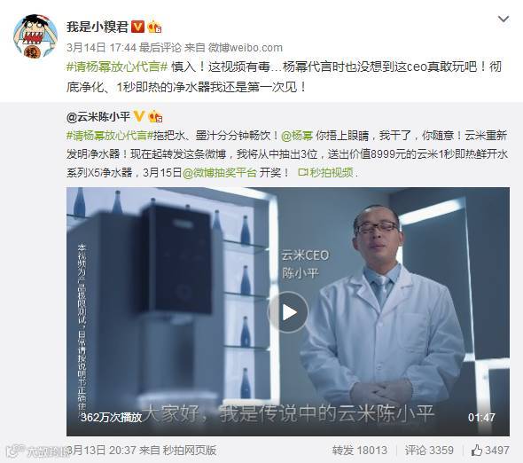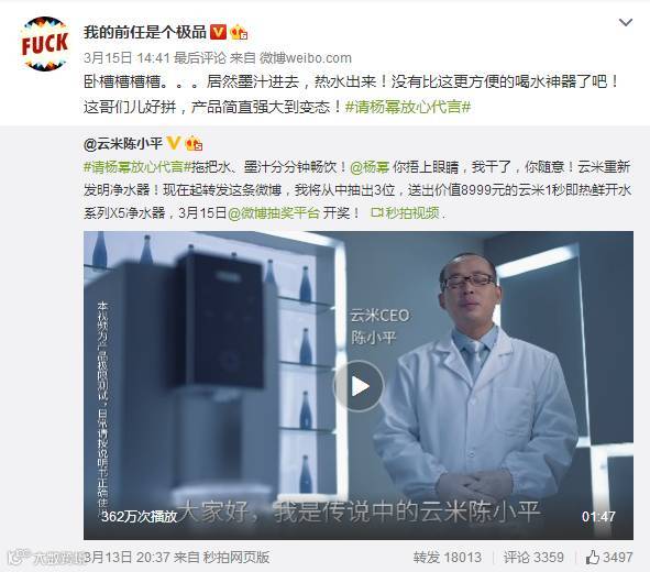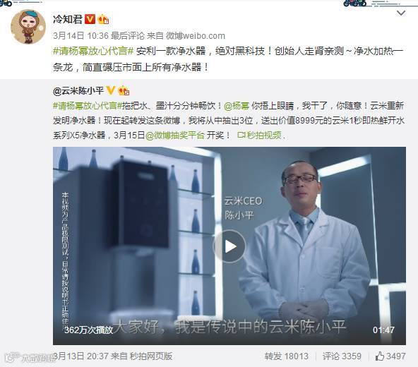 云米CEO自曝喝墨汁视频,为杨幂证明自家产品好品质