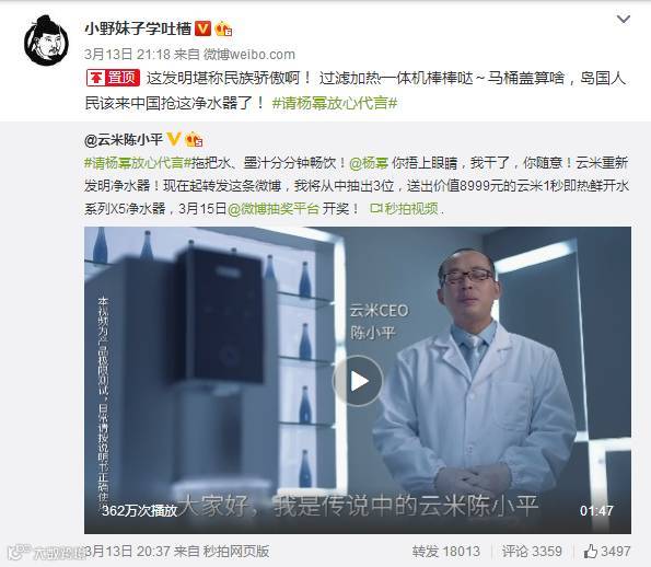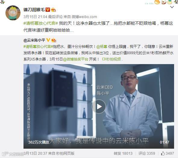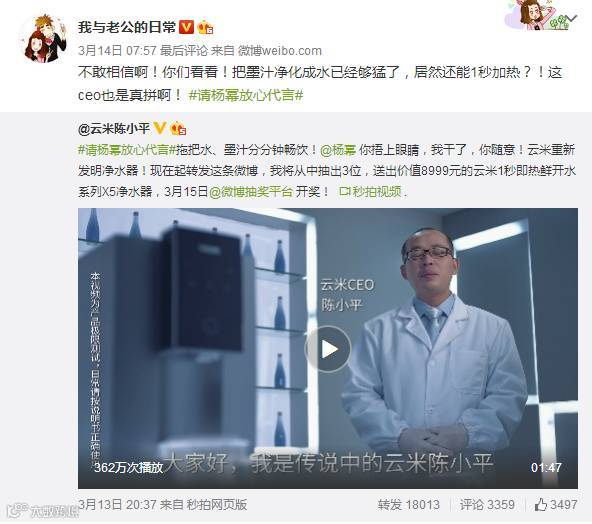 小米生态林企业云米旗下的净水器产品特邀一线明星杨幂代言,云米CEO在社交媒体上曝出喝墨汁的视频,并推出话题#请杨幂放心代言#,独特的宣传技巧加上杨幂的高超人气,话题一经推出,迅速引起热议。