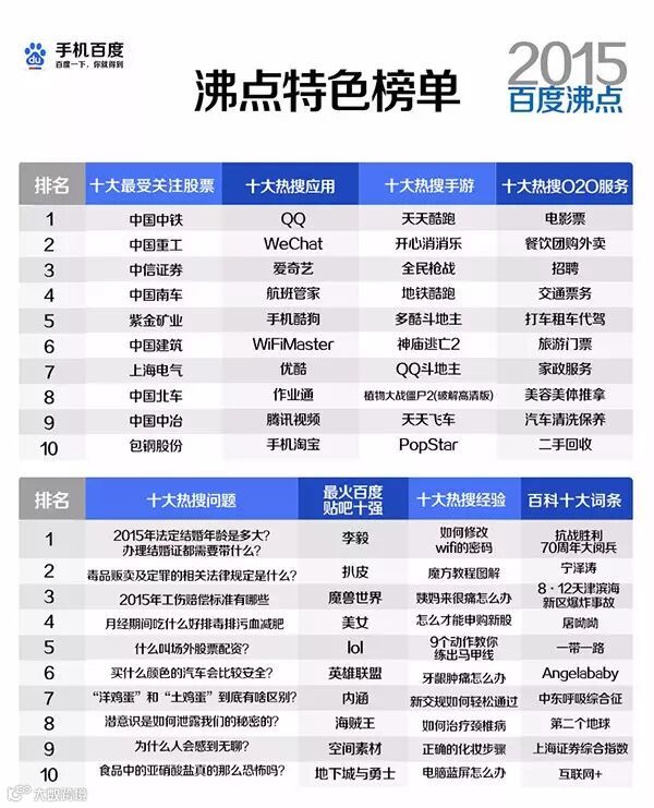 再看百度,十大热搜词语中也不乏有淘宝、百度、双色球等很强的服务属性关键词出现,与往年不同的是,今年还一下推出了9个移动搜索榜单,其中无论是按时段分类的用户行为榜单,比如“日出东方十大移搜热词”、“茶余饭后十大移搜热词”等,还是移动热搜O2O榜单,都把人们搜索服务的需求表现得淋漓尽致,这是与Google榜单非常不同的一点。