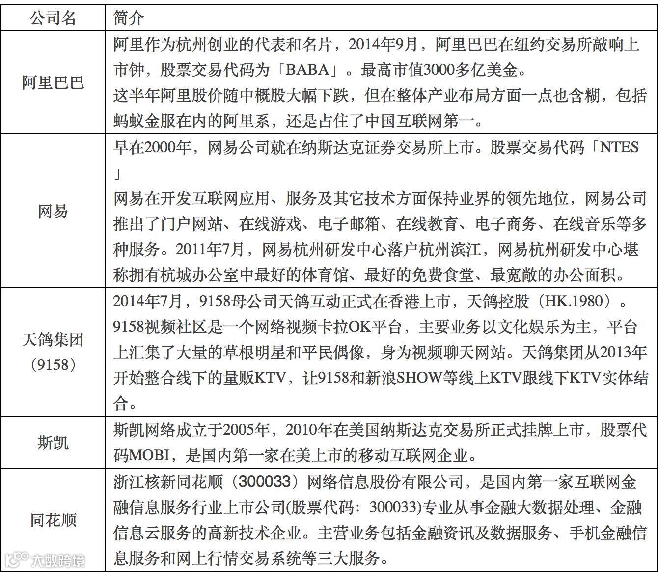 每个适合创业的城市总会有很多家值得尊敬的公司,他们一方面是榜样,一方面也为创业公司输送人才,形成一个生态系统,阿里系和网易系可能是最明显的群落了。这些优秀公司的成功IPO也鼓舞着创业者们不断努力和创新。