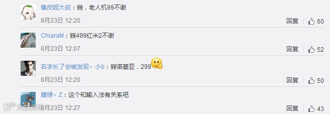 第二类:留下“槑”字以后,再留下类似于我是499、699、山寨机等等的评论。