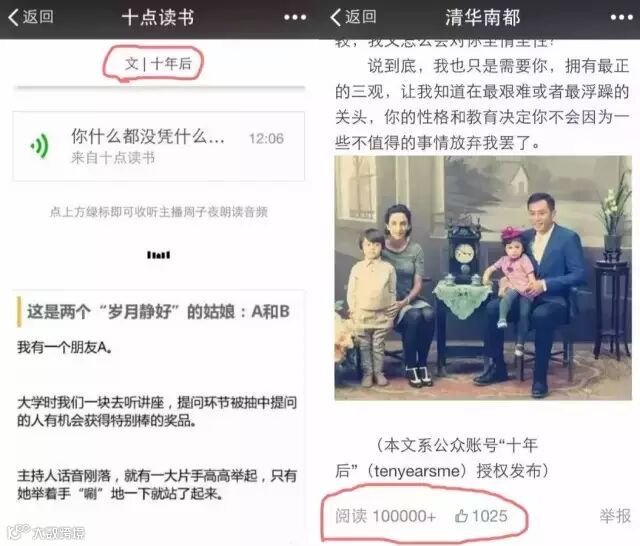 十点读书和清华南都作为积淀深厚的微信大号,有庞大的粉丝基数,很容易将一篇优质文章加热成爆文。而类似“十年后”这样年轻又底子薄的公号,尚且处在粉丝积累阶段。