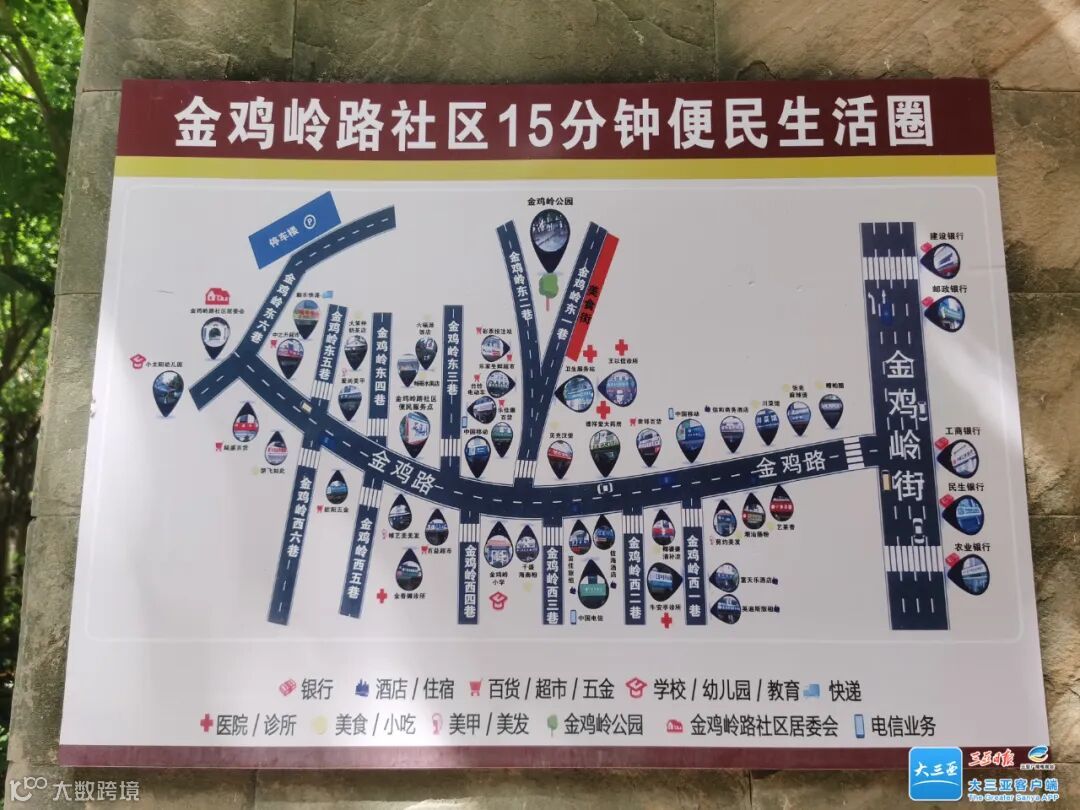 “银行、酒店、百货超市、医院、学校、快递、公园、电信营业厅等,一应俱全。”刘大爷一边指着地图一边告诉记者,小区悬挂的地图,信息量很大,设计感很强,满眼看到的皆是平日生活经常去的地方,就连金鸡岭公园都标注得十分醒目。