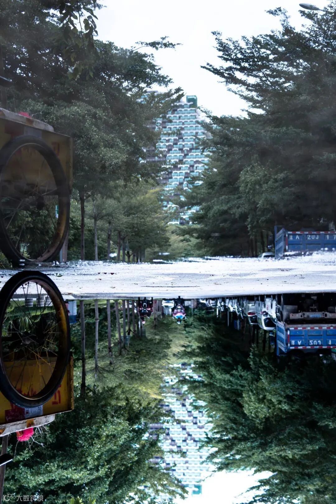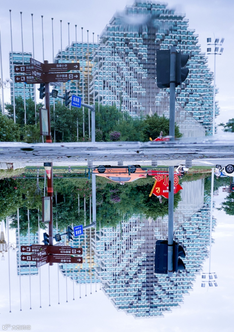 任何事物都有倒影,城市的风景也不例外。雨后的路上,一个镜像版的城市就出现了。下雨天的凤凰岛,建筑像被水洗了一样,也开始照镜子。