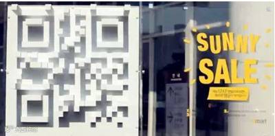 超市在中午的时候,人流量和销售量总是很低,于是韩国Emart超市别出心裁,在户外安装了一个shadow QR code取名为sunny scale,只有在正午太阳直射地球时,二维码才可以被正确读取。他们巧妙利用太阳和影子之间的物理原理增添了扫二维码的乐趣。当人们扫出二维码之后就可以跳转到超市的网站页面,可以获得超市的打八五折的优惠券,可以选择区超市购物,也可以再网上直接选购,配送人员会提供送货上门的服务。