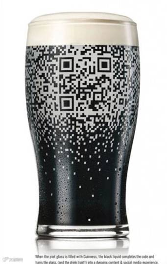 一款社交饮品的Guiness’s QR啤酒,只有在瓶子里装满了Guiness黑啤酒之后二维码才能显示,通过扫描Guiness’s QR啤酒瓶上的二维码可以发推文,更新你的Facebook状态、在foursquare签到、下载电子优惠券,邀请你的朋友们一起来参加活动。为了活跃午间用餐的消费,品牌商将扫码时间确定在中午才能进行。