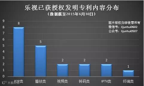 通过上表,我们可以看到,在乐视已经获得授权的发明专利中,基本以电视或网络视频为主,覆盖“P2P、播放、视频、转码、IPTV”等技术领域,其中,P2P、播放等为代表的视频播放类相关专利占比靠前。