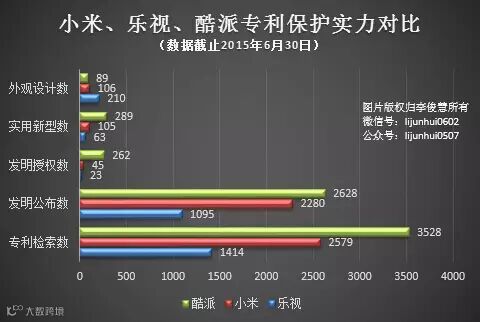 通过上表,我们可以看到,酷派、小米、乐视三家,两两PK专利的话,相互之间的差距还是比较明显的。在专利检索数上,酷派是小米的1.4倍,小米是乐视的1.8倍;在发明公布数上,酷派是小米1.2倍,小米是乐视的2.1倍;在发明授权数上,酷派是小米的5.8倍,小米是乐视的1.9倍;在实用新型数上,酷派是小米的2.8倍,小米是乐视的1.7倍;而在外观专利数上,乐视是小米的2倍,小米是酷派的1.2倍。