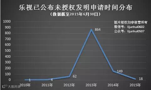 截止2015年6月30日,乐视已提交申请未授权的发明专利申请共计1095件,从提交申请的时间来看,大多数集中2013年,当年提交的申请占其已提交申请总量的79%。