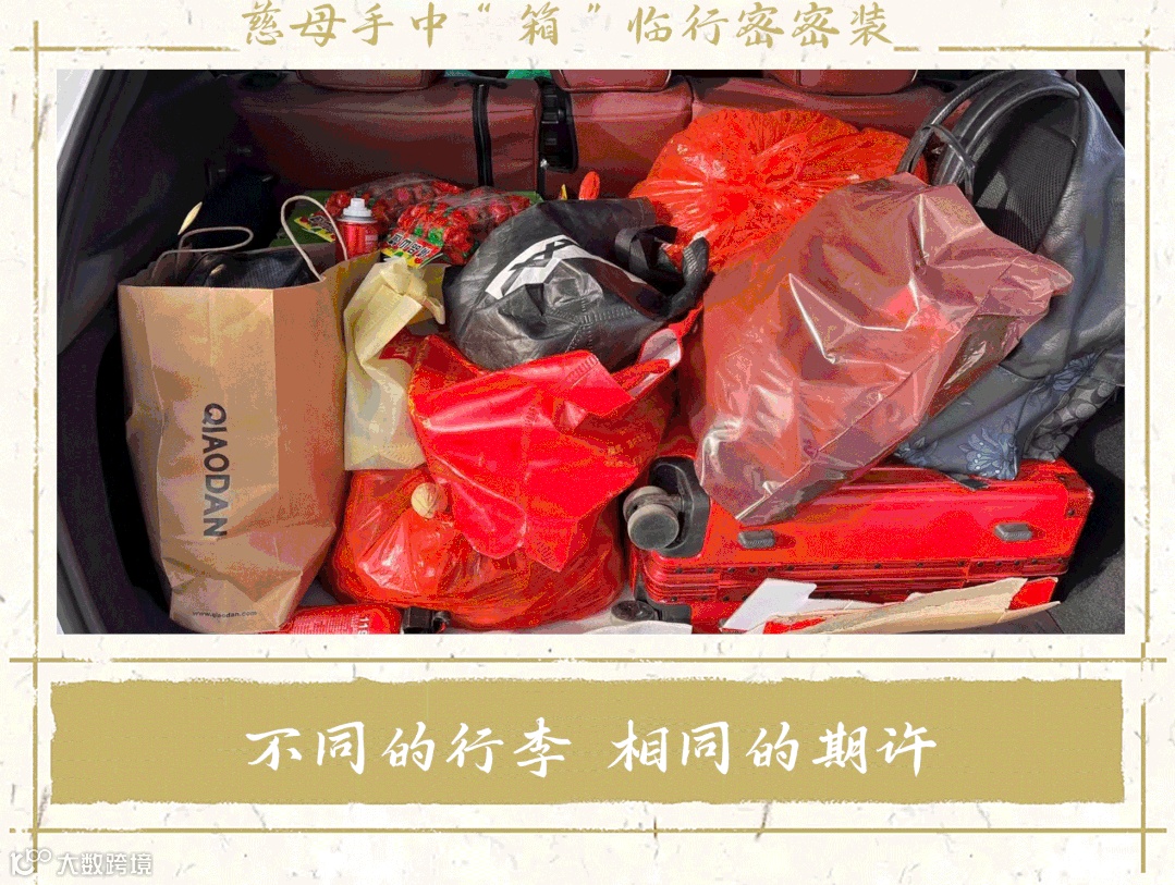 自家养的鸡、地里种的菜、早就准备好的土特产.....沉甸甸、满当当,“家乡的味道”被装在红色的袋子里小心封存,犹如亲人的爱,又沉又香。