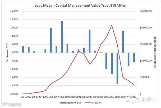 上图记录的是美盛集团(Legg Mason)的价值信托基金(Value Trust Fund)的历史业绩。蓝色柱(左轴)代表该基金每年超过或者落后基准(标准普尔500指数)的回报数额,红线(右轴)则代表该基金管理的资金数量。该基金的经理比尔米勒(Bill Miller)先生是美国最优秀的基金经理之一。