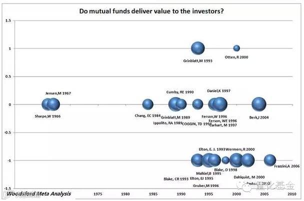 例如,从上面Woodsford的Meta分析图表显示,大多数研究(只有少数例外)发现∶基金经理们的回报要么和一个被动的市场指数(比如上证50)回报差不多,要么还不如一个被动的市场指数。