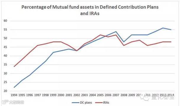上图显示,到2014年,美国的退休养老金计划把约55%的资产放在共同基金(Mutual Fund)行业里。大家都知道共同基金的主要投资目的即为战胜市场(例如,S&P 500指数)。所以总体来说,应该还有相当多的人相信基金经理能够创造价值。