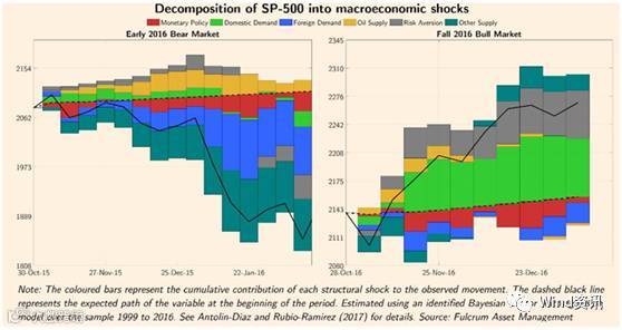 根据Juan Antolin Diaz设计的“经济震惊”(economic shocks)模型,今年和去年经济差别表现的更明显了。去年美联储收紧货币政策,全球市场疲软拖累美股,而今年美国国内市场信心爆棚,风险溢价下降。