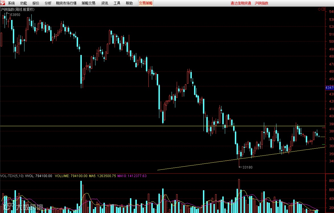 从周线图来看,铜还是在低位驻底,但他的低点逐渐的在抬高,所我们只需要等待他突破。