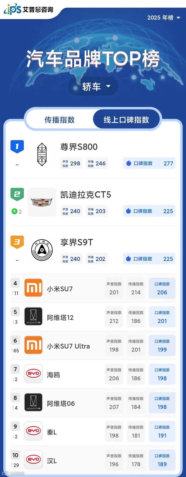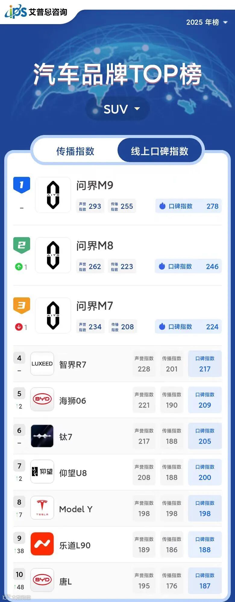 2025年线上口碑指数排名前三的汽车车型为:问界M9(口碑指数278)、尊界S800(口碑指数277)、问界M8(口碑指数246)。