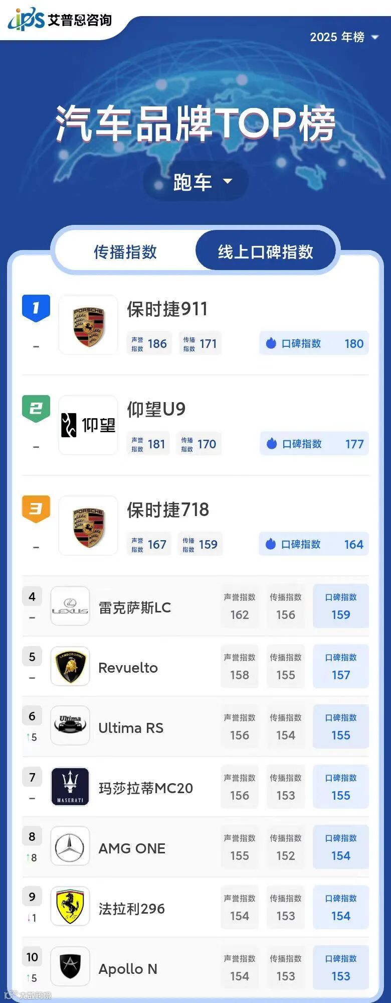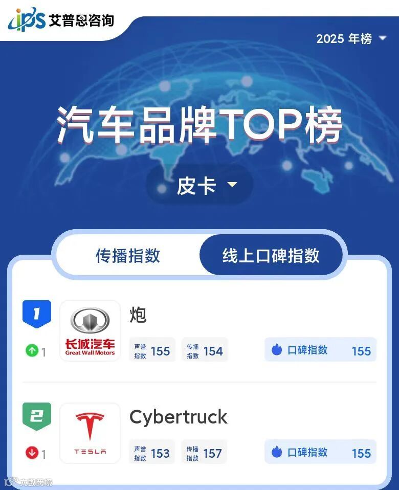 线上口碑指数排名前三的跑车车型为:保时捷911、仰望U9、保时捷718;线上口碑指数排名前二的皮卡车型为:炮、Cybertruck。