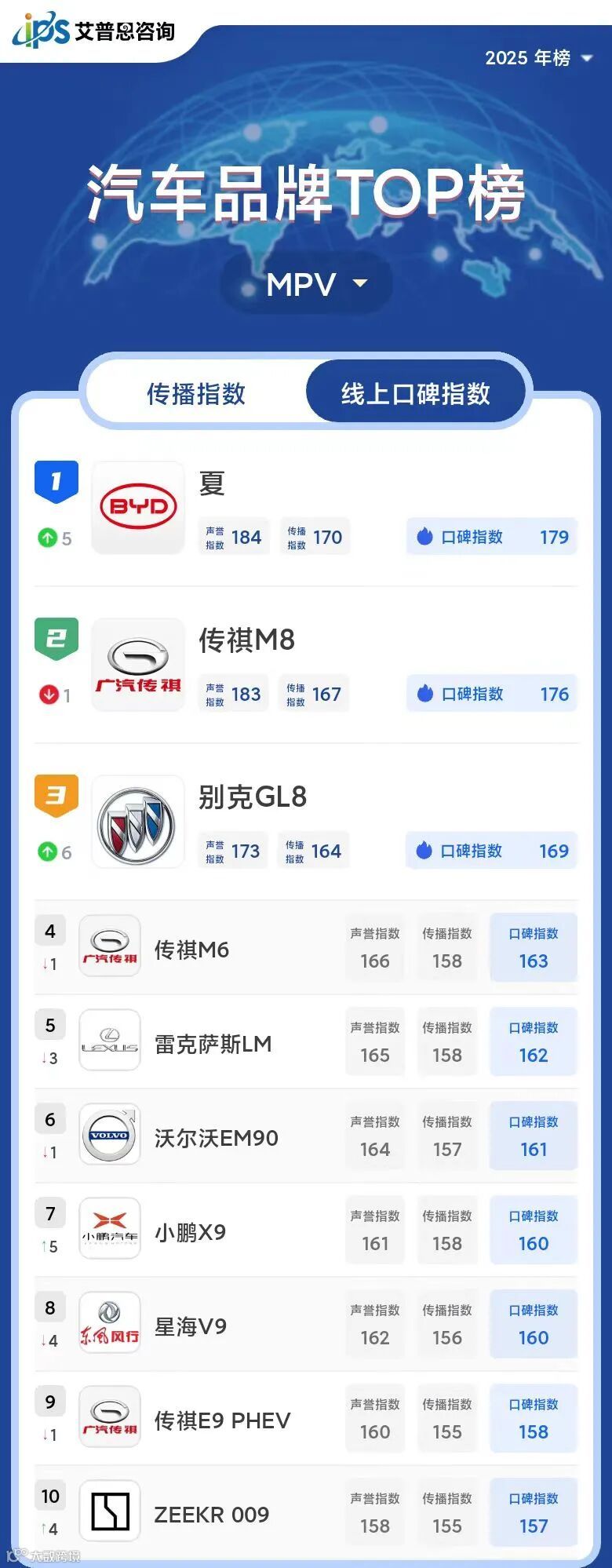 线上口碑指数排名前三的轿车车型为:尊界S800、凯迪拉克CT5、享界S9T;线上口碑指数排名前三的SUV车型为:问界M9、问界M8、问界M7;线上口碑指数排名前三的MPV车型为:夏、传祺M8、别克GL8;