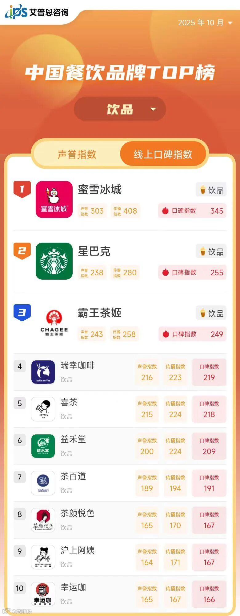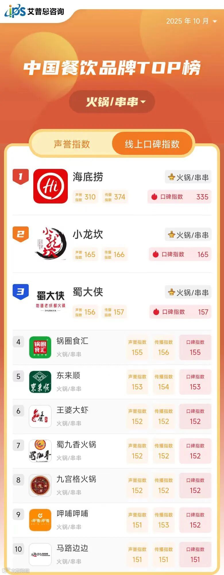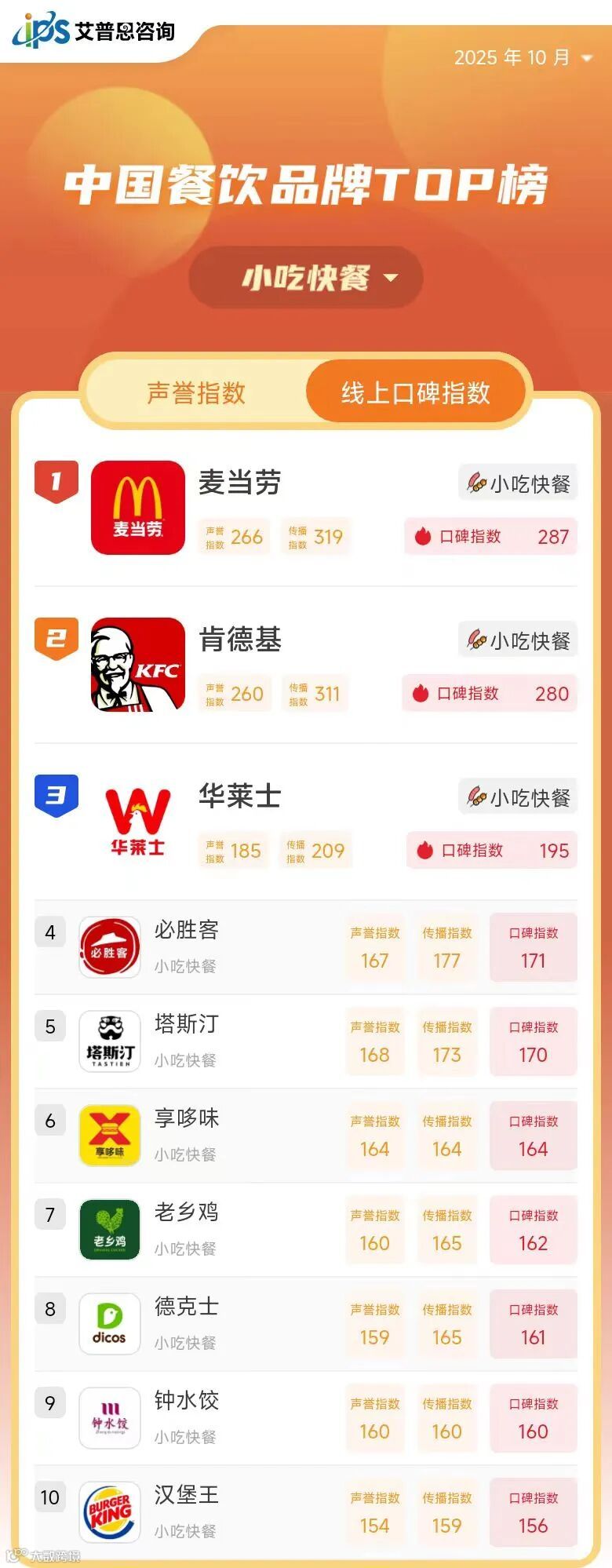 线上口碑指数TOP10