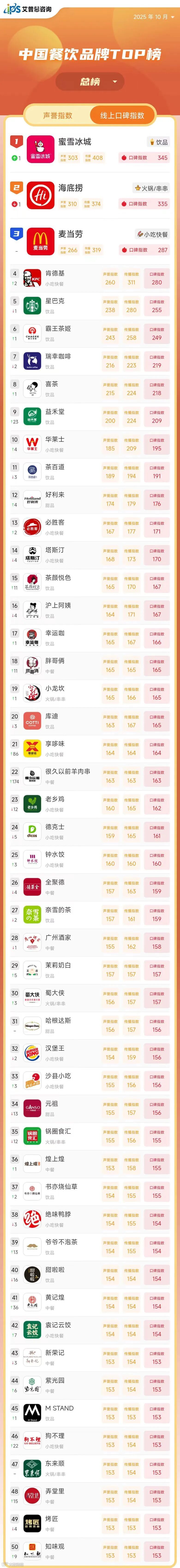 从子指数的表现来看,10月传播指数最高的餐饮品牌为蜜雪冰城(传播指数408,声誉指数303),声誉指数最高的餐饮品牌为海底捞(传播指数374,声誉指数310)。