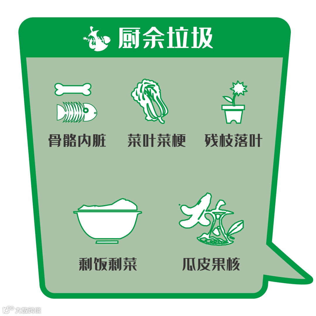 主要是指家庭烹饪消耗产生的垃圾,例如蔬菜、瓜果、残余物、腐肉、动物碎骨。蛋壳等,都应丢进绿色的厨余垃圾桶里,这些垃圾一般被直接运输到厨余垃圾处理场。