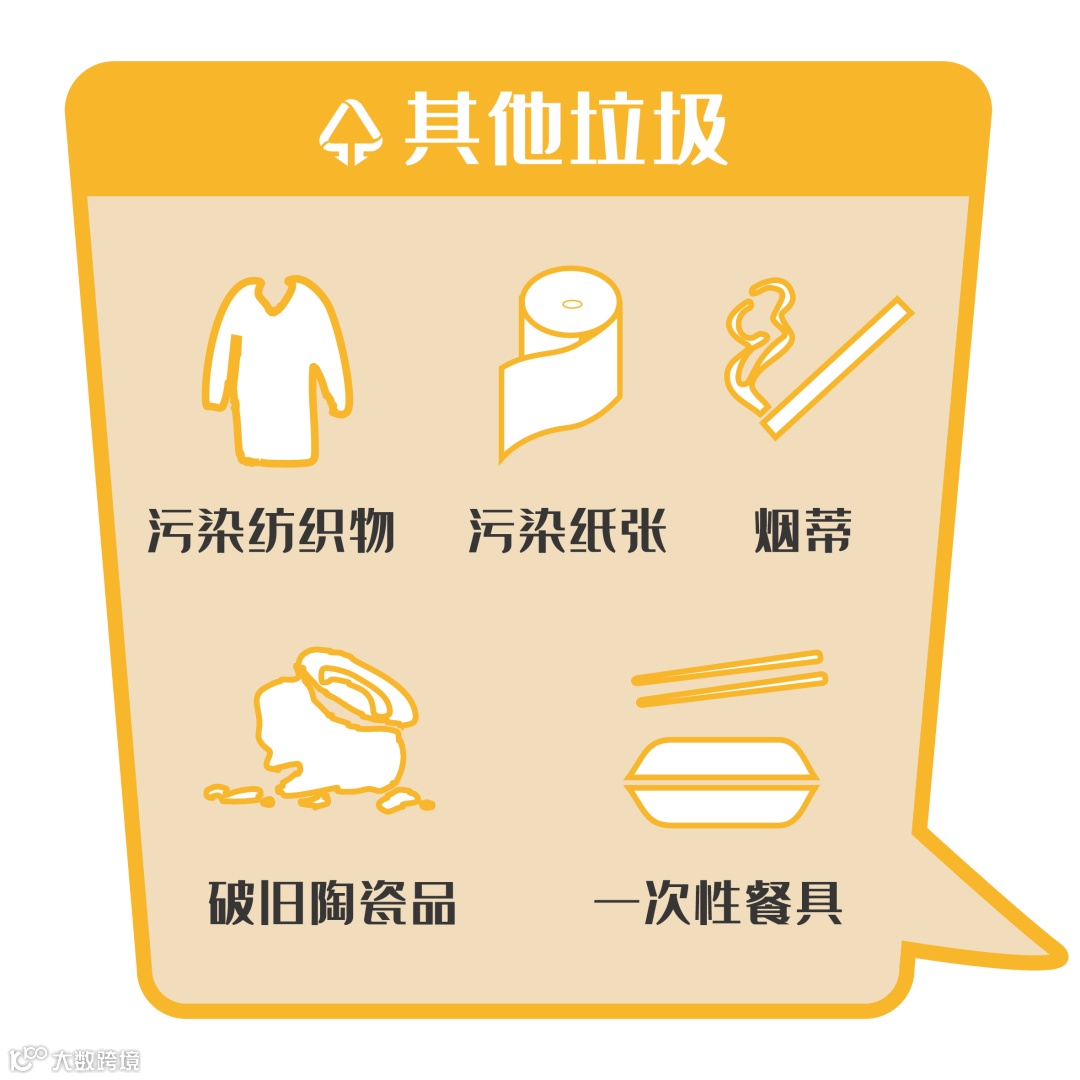 除开以上其他的生活垃圾都可归入其他垃圾类。主要包括受油污污染的废纸、纸尿裤、一次性餐具、化妆品容器、破损陶瓷餐具、烟蒂、尘土等这些垃圾都应被扔进灰色的垃圾桶里,再运输至垃圾焚烧厂进行焚烧发电。