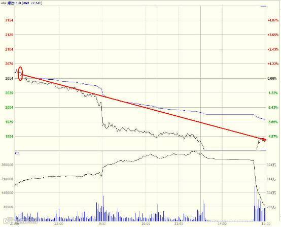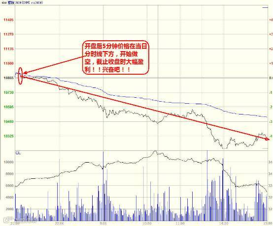 你可以如图在开盘后5分钟,如果价格在分时线之上做多,在分时线之下做空,如图所示,如果你做了空单,当天盈利非常可观,接近一个跌停板的利润。用这种方法一位投资者在螺纹钢一个品种上短短几年时间就盈利几十亿的利润。当然你也可以做到!因为这种方法并不难,你也可以获取十几亿的利润。因为只要你会电脑,你有几千块的启动资金,按照这种方法你就可以一直盈利下去。因为这样的案例实在太多,不信你可以自己找找。