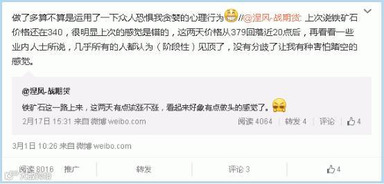 当价格上到340之上时,我在2月17日也发了条微博说感觉是在做头了,于是我那几天就等着看可不可以空进去,但没等到即又上去了,这次又错了,而且后几天的走势证明这感觉错的很离谱。