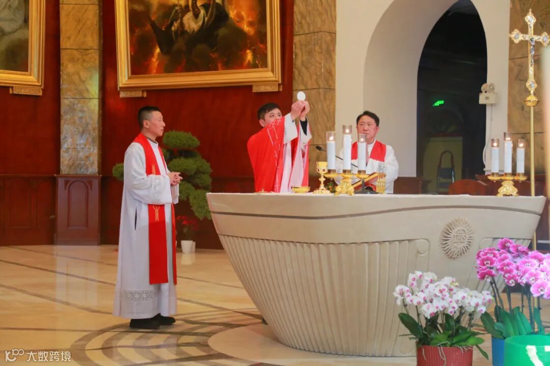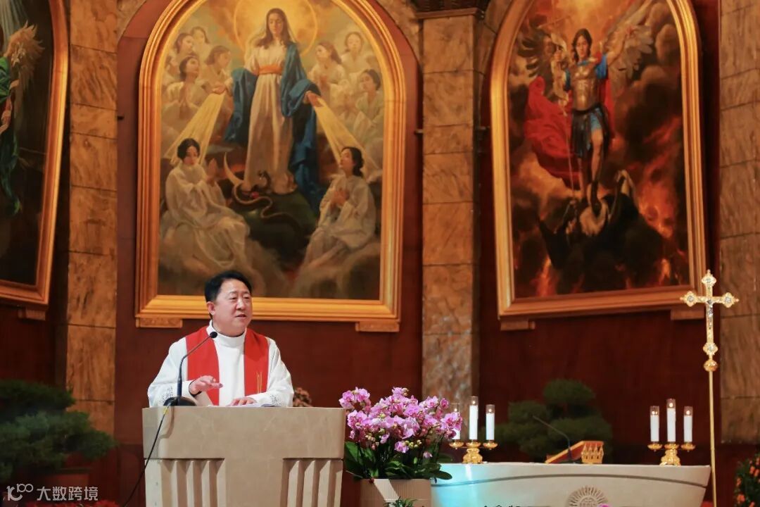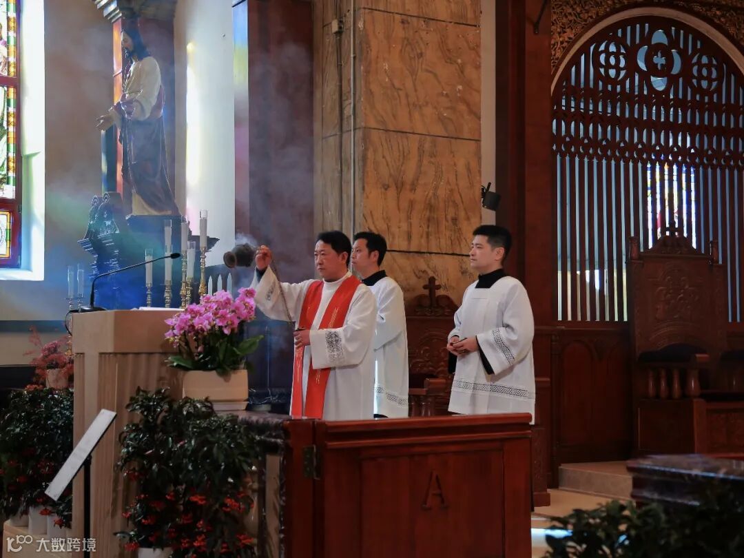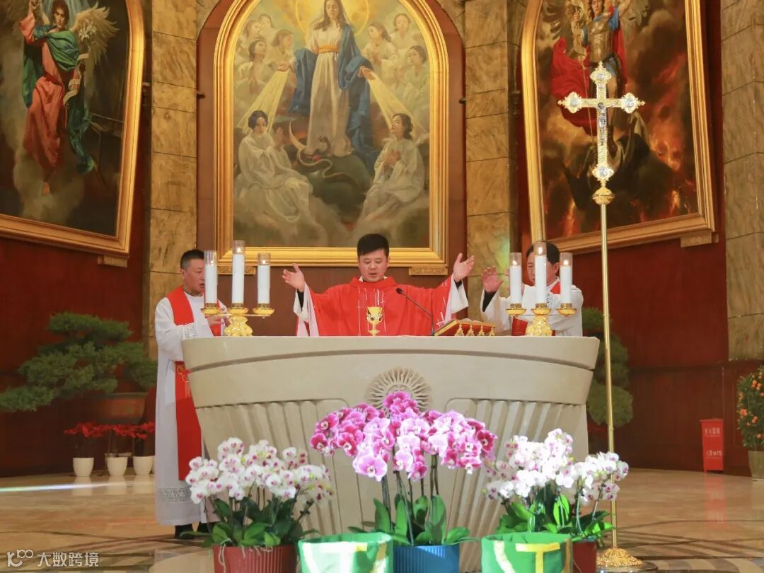 下午 3 点,除夕感恩弥撒开始。本台弥撒由北京南堂副本堂姜列群神父主礼,本堂张洪波神父讲道,张弛神父共祭。