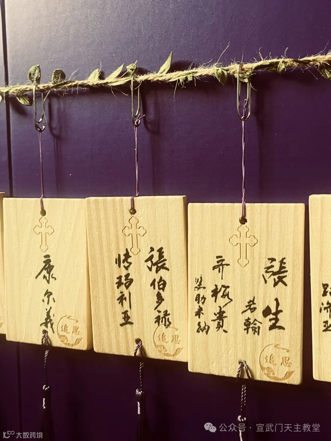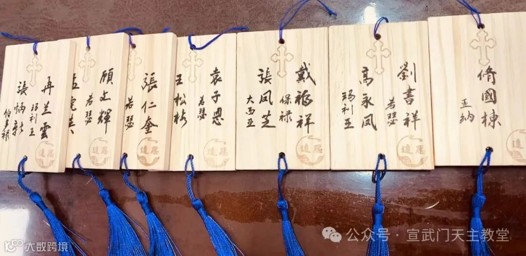 我们制作好的已故者追思牌,上写有故人们的姓名.圣名,每张追思