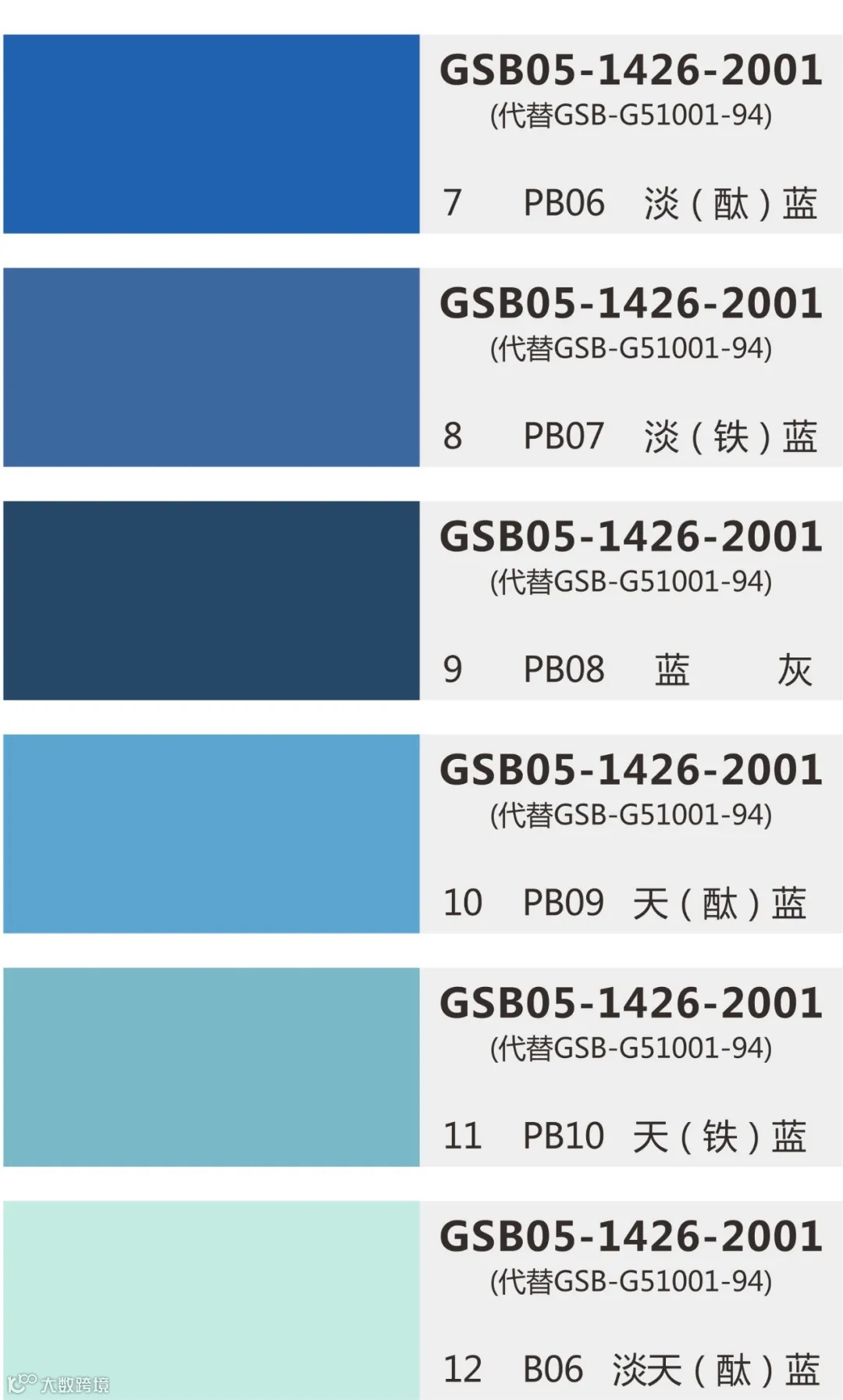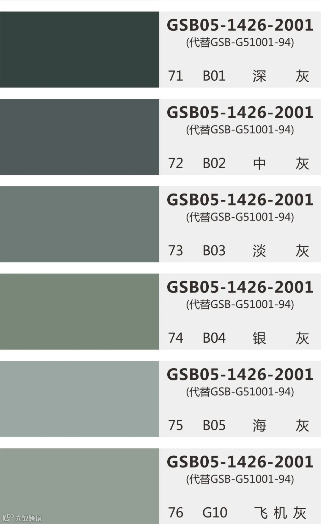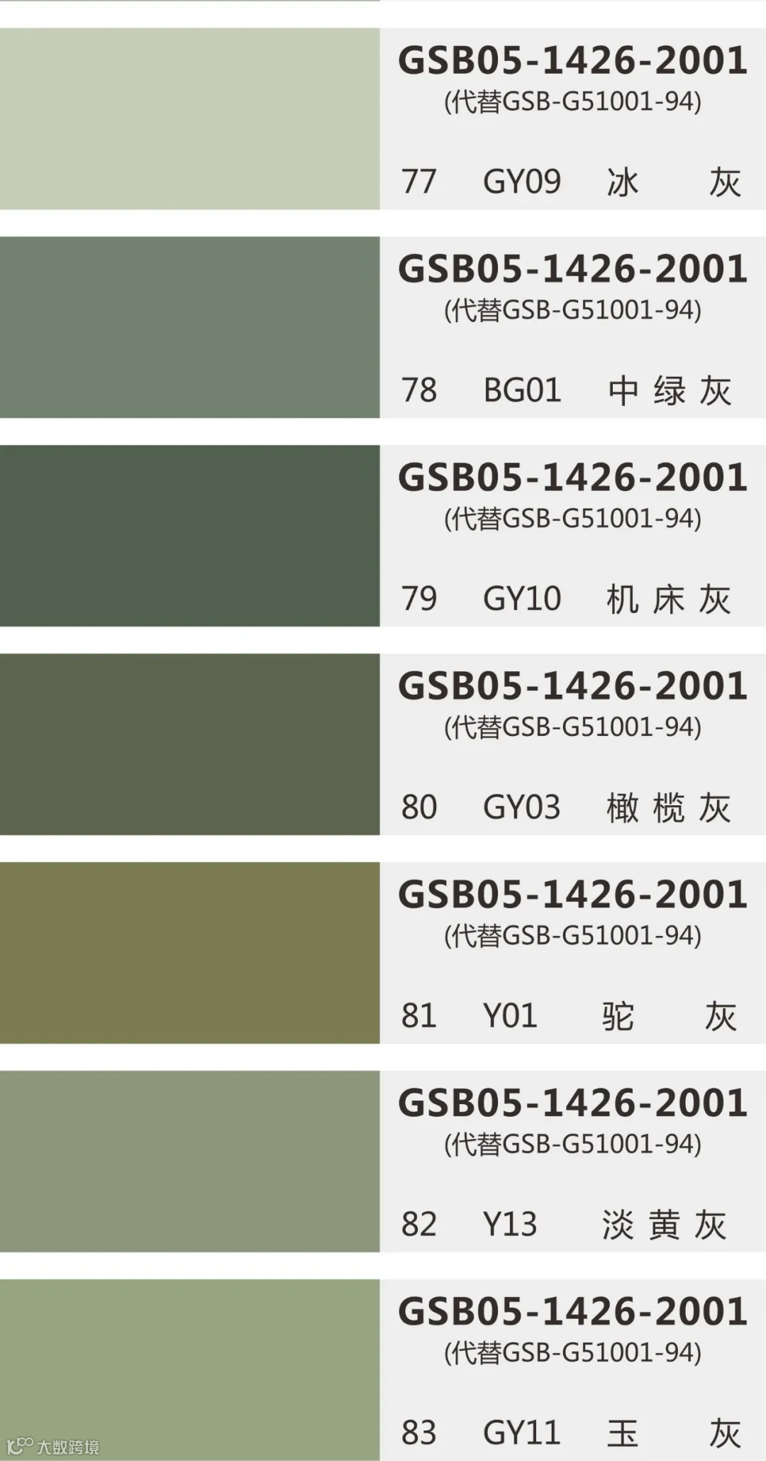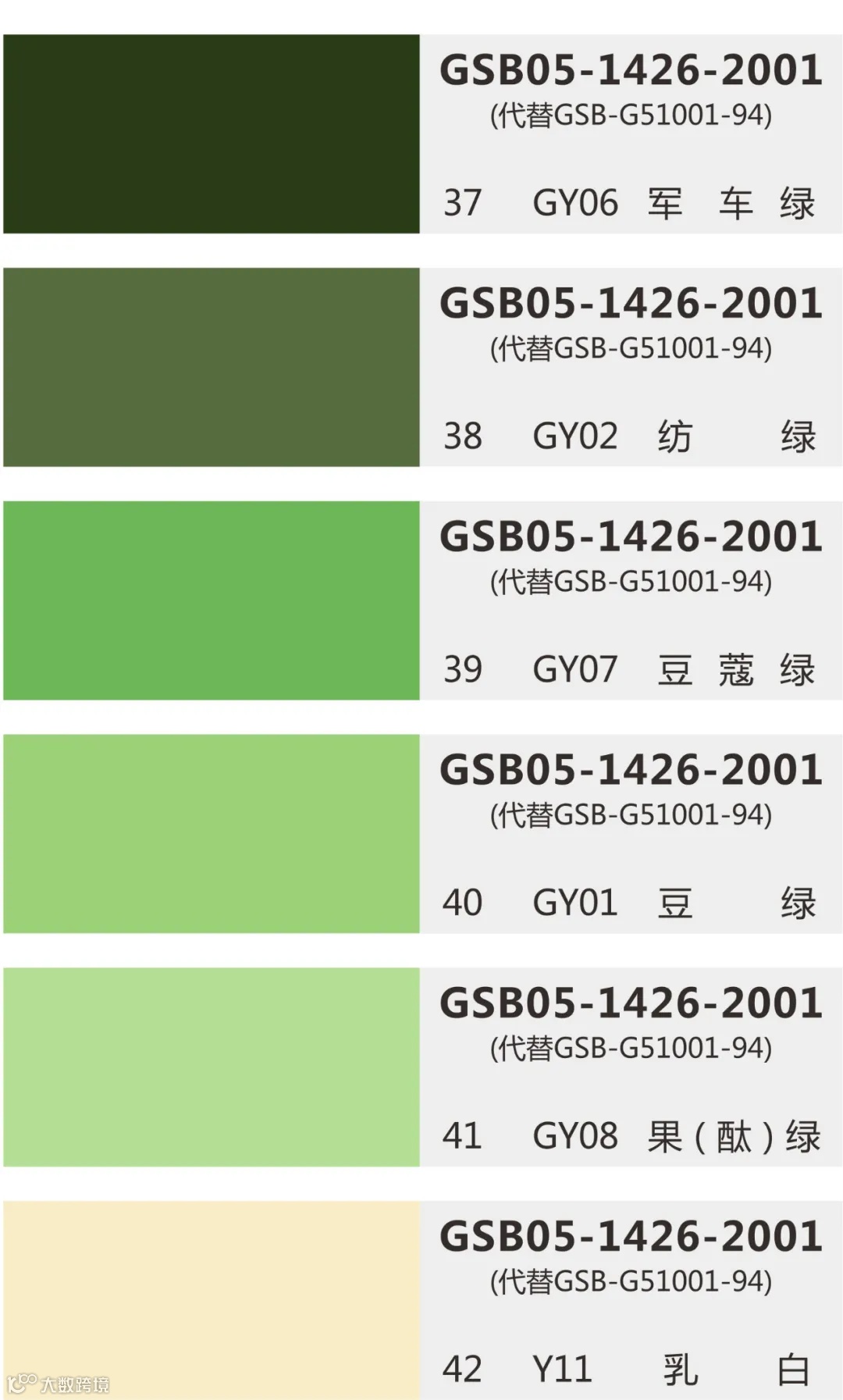 GSB05-1426-2001 (代替GSB G51001-94) 是全国涂料和颜料标准化委员会根据国家标准GB3181制作的实物标准色卡,在涂料、油漆、颜料、塑胶、金属涂装,等各行业均被广泛采用。含83种颜色,光面效果。每个颜色都有国家统一标准的编号,适用于油性涂料方面使用。