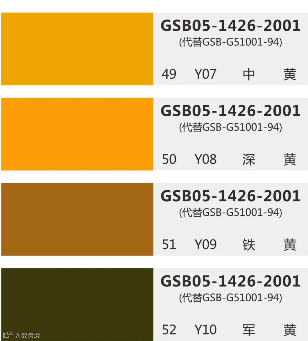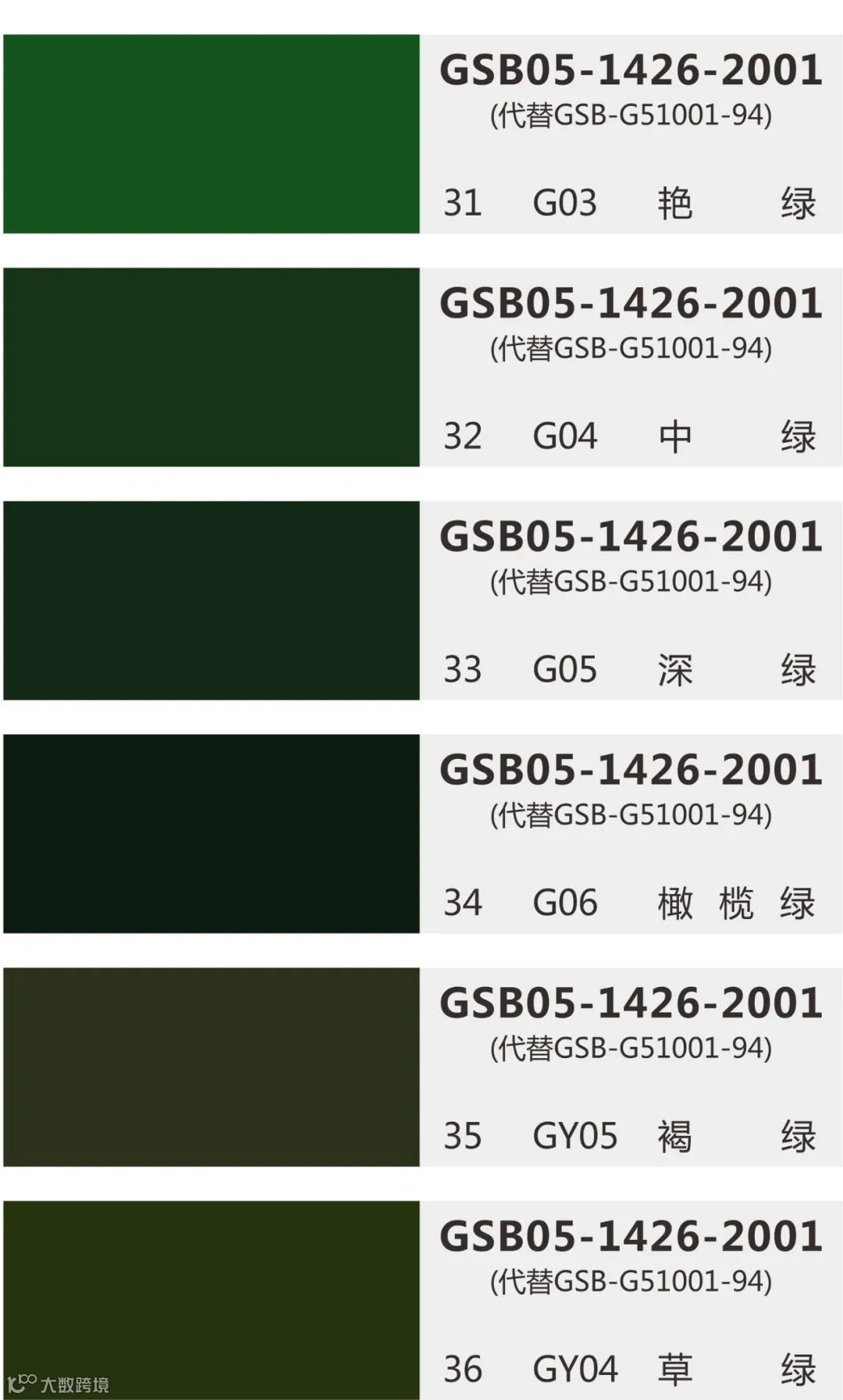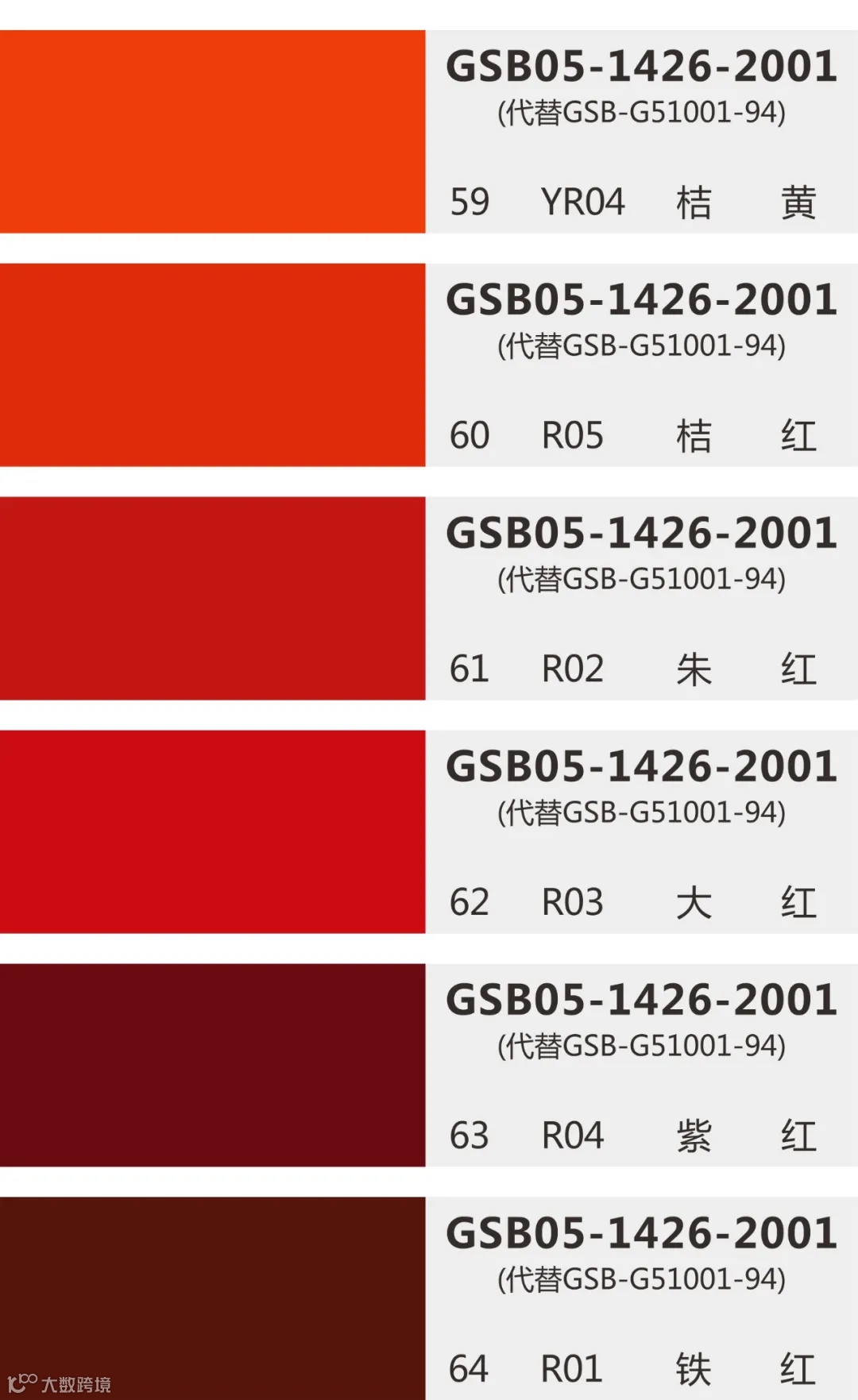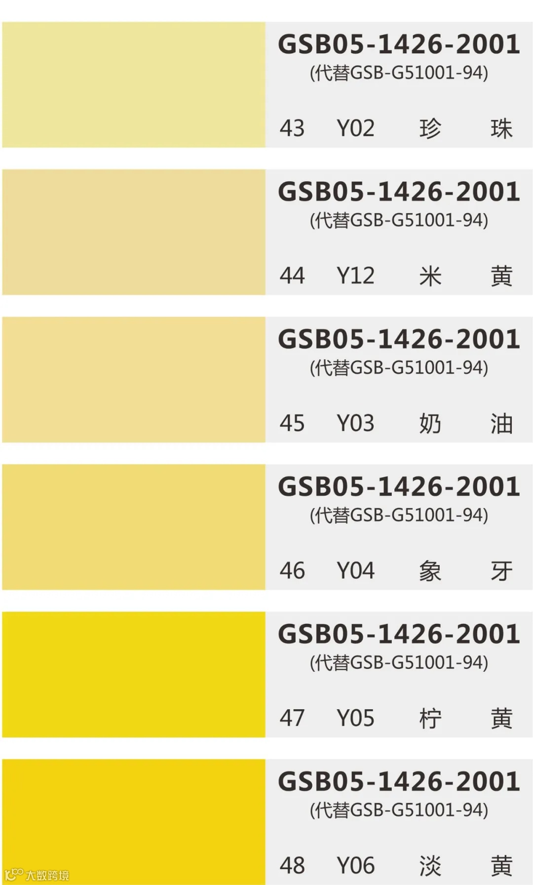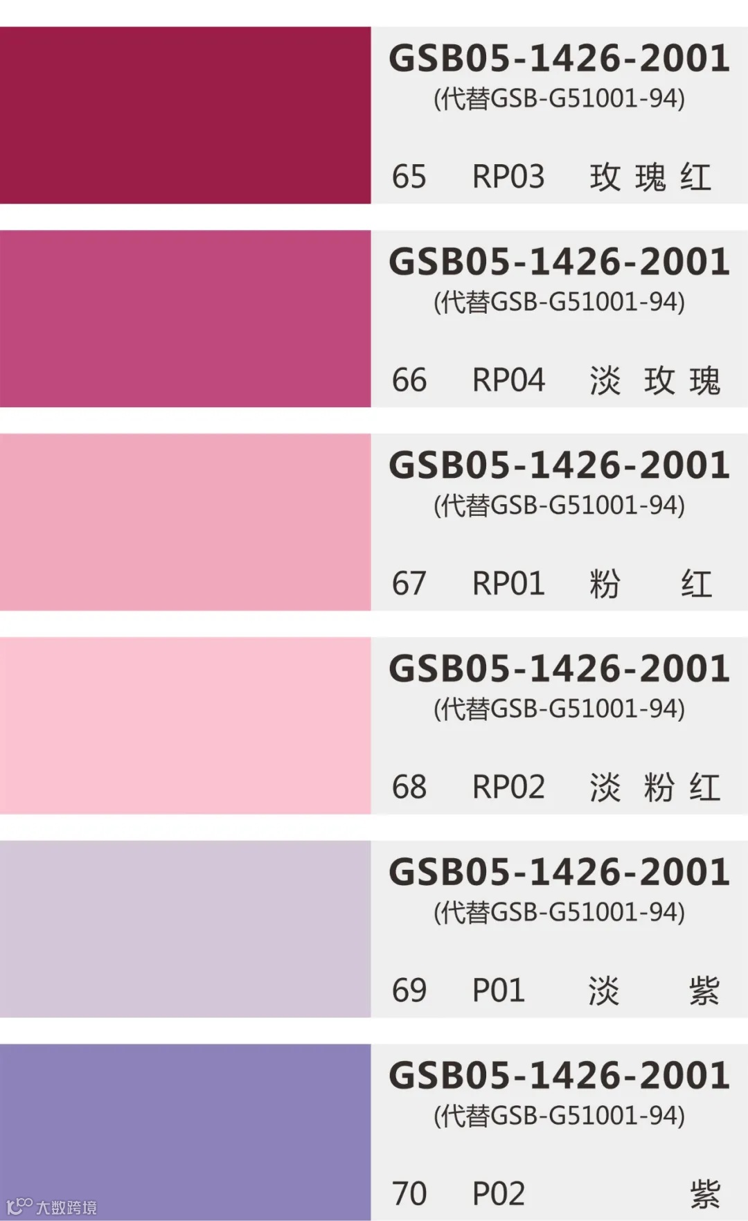 GSB05-1426-2001 (代替GSB G51001-94) 是全国涂料和颜料标准化委员会根据国家标准GB3181制作的实物标准色卡,在涂料、油漆、颜料、塑胶、金属涂装,等各行业均被广泛采用。含83种颜色,光面效果。每个颜色都有国家统一标准的编号,适用于油性涂料方面使用。